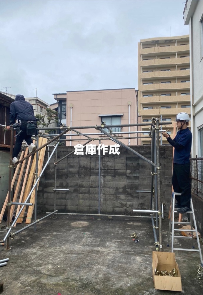 2026.3.1人数が増えた分、使う道具類もたくさんになってきました。…しまうとこないなぁ…そぉだ!道具をしまう倉庫、つくろ!思い立ったらすぐ行動!と言うことで、単管倉庫作成中の写真です。新人くんと半年先輩くんの2名、今度の出張でペアになる2人の連携も観察しながら指導して作成にとりかかってます!